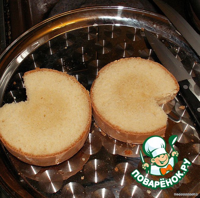 Маленький коржик разрезаем пополам, вырезаем сегмент (это будет пещера).