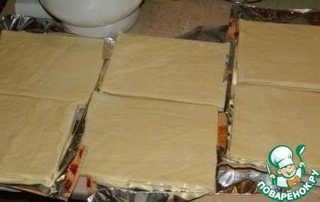 Раскатываем каждый пласт теста очень тоненько до размеров противня. Выпекаем при 190 С до румяного цвета.