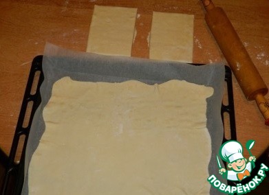 Слоеное тесто размораживаем и делим на 8 одинаковых частей.