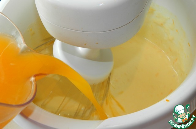 Хорошо перемешиваем яйца, цедру апельсина, муку и стакан молока. Вливаем апельсиновый сок.