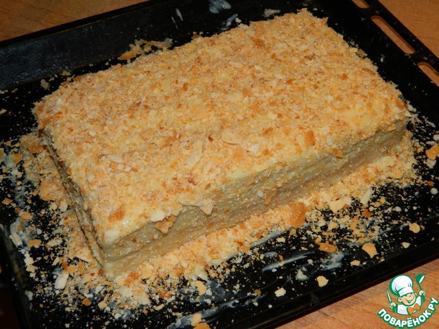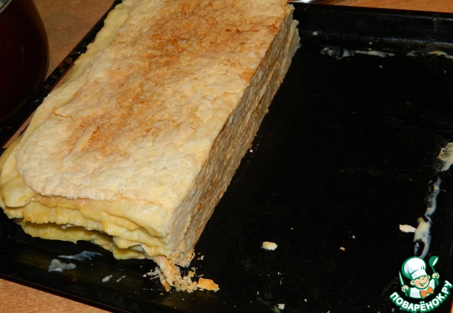 На него кладем сверху другой противень и немного прижимаем. Хруста не пугаемся, но и сильно жать, чтобы вытекал крем, не надо. Просто делаем плотнее коржи к друг другу. Оставляем так при комнатной температуре на 3-4 часа, для пропитки. Затем убираем на несколько часов в холод для застывания.