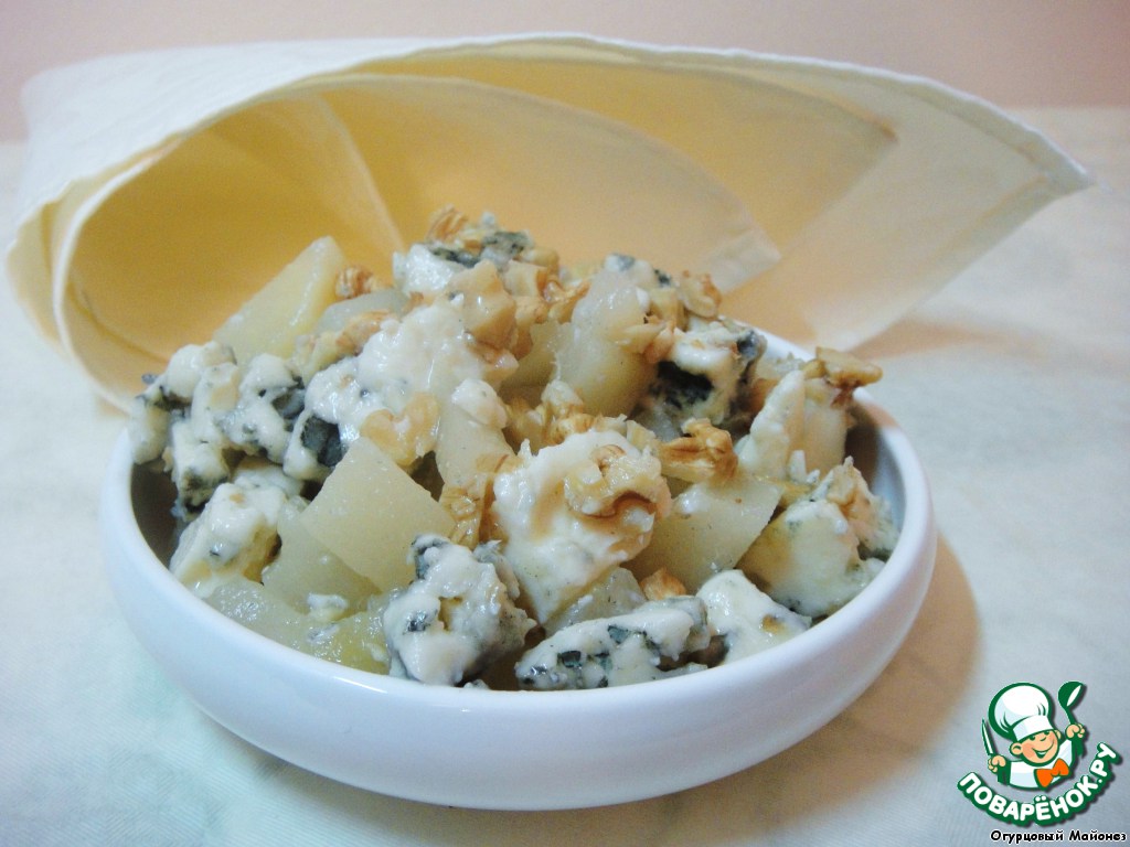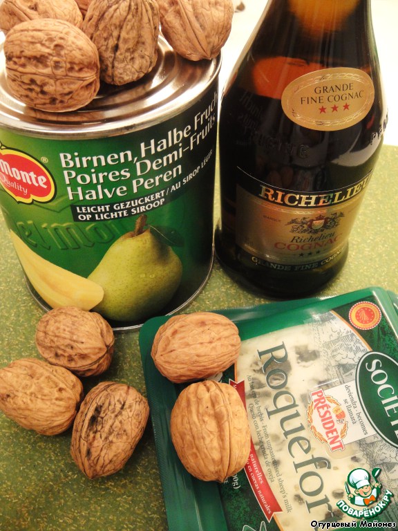 Добавляем нарезанный кубиками голубой сыр и заправляем коньяком.