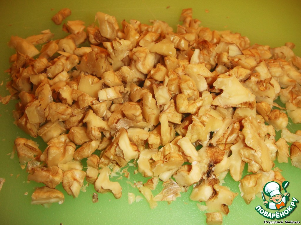 Чистим грецкие орехи и крошим их, но не очень мелко.