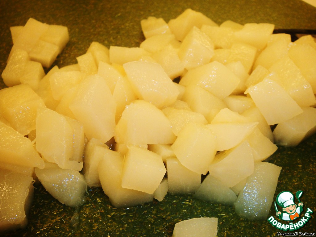 Сливаем сироп из банки с консервированными грушами, а сами груши нарезаем кубиками.