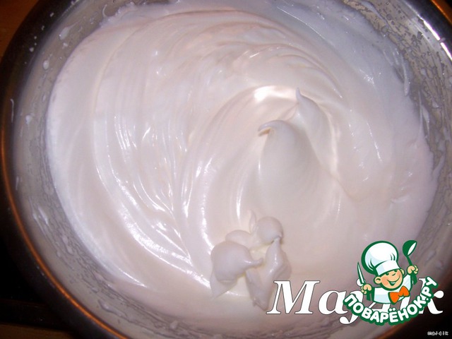 Отдельно взбить белки со щепоткой соли, постепенно добавляя саxар, в крепкую и устойчивую пену.
