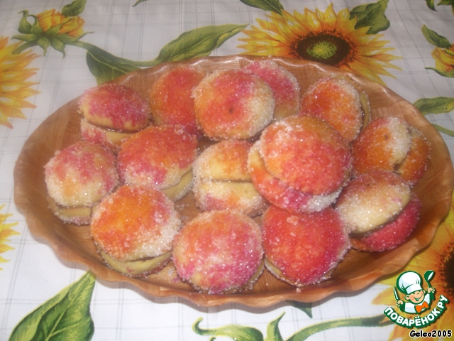 | Изначально рецепт называется "персики с алькермесом", но я добавляю любой другой сладкий ликер, в оригинальном рецепте также не указано количество масла, я подбирала методом проб и ошибок. В общем-то ничего особенного - вкусное, красивое, нежное печенье, но мужу очень нравится)) |