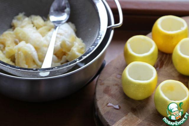 Устанавливаем сито на миску и аккуратно извлекаем сердцевину лимонов.