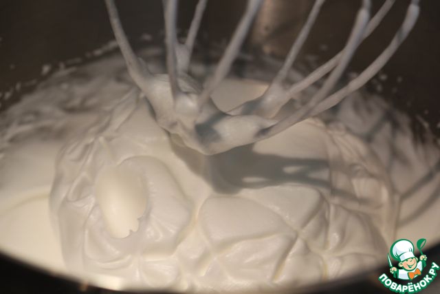 Белки смешиваем с сахаром в чаше миксера. Ставим чашу на водяную баню и, все время помешивая, держим до полного растворения сахара. Белковая масса должна стать теплой. Включаем миксер и взбиваем на средней скорости до блестящих и мягких пиков.