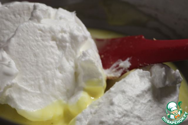Смешивайте меренгу с желтковой заварной массой в три подхода.