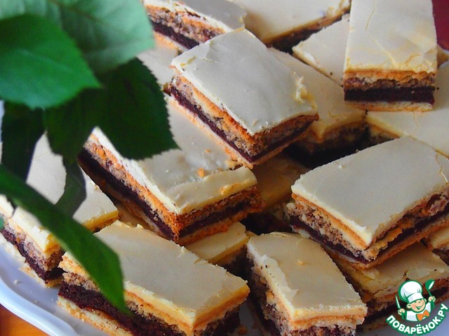 И это, дорогие граждане, все, финита! Осталось только дождаться, пока наше произведение остынет, потом подравнять ножом края и разрезать на пирожные. Яичная глазурь хрупкая, но режется хорошо, немножко трескается, но в этом есть определенный шарм, согласитесь.