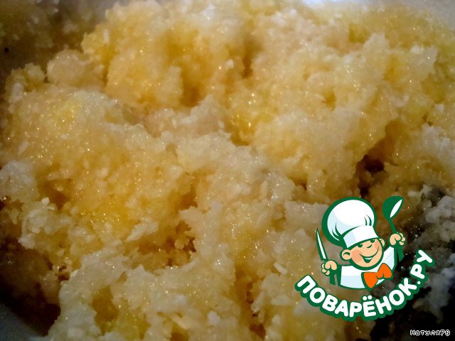 Приготовим кокосовый крем, смешав сахар, два яйца, кокосовую стружку, ванилин и коньяк. Взбивать не нужно!