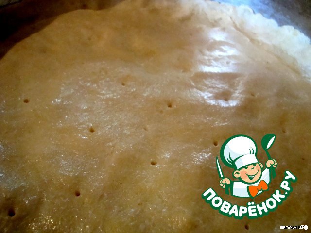 Раскатать в пласт толщиной 0,5 см, уложить в форму, выстланную бумагой для выпечки, сделав небольшие "бортики". Наколоть вилкой в нескольких местах и выпекать в духовке 15-20 минут при температуре 180 градусов.