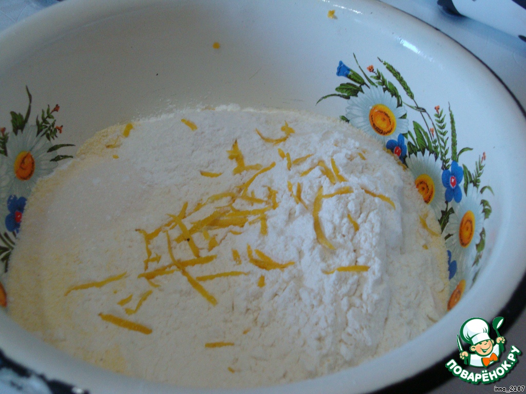 В миске смешать пшеничную и кукурузную муку, разрыхлитель, ванилин и цедру.