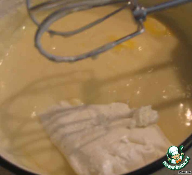 снимаем крем с огня добавляем масло, творог и взбиваем миксером в пушистую кремообразную массу