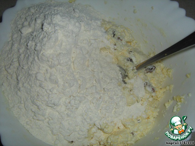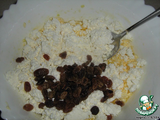 Всыпаем пропущенный через мясорубку творог и изюм.