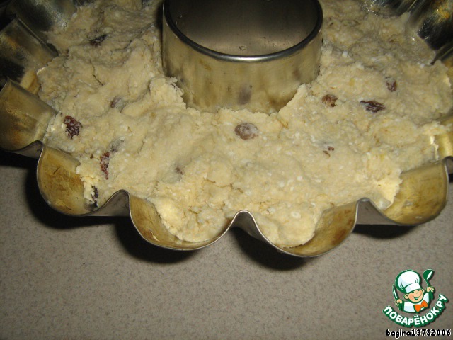 Тесто выкладываем руками, т.к. оно довольно плотное, в смазанную маслом (можно еще присыпать мукой) форму и слегка утрамбовываем, чтобы заполнить пустоты и выровнять поверхность.