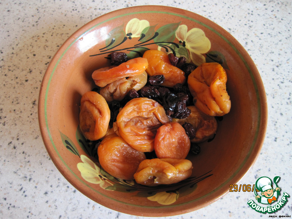 Изюм и курагу замочить. Затем слить воду и нарезать.
