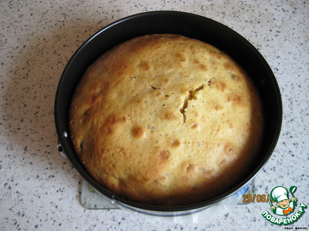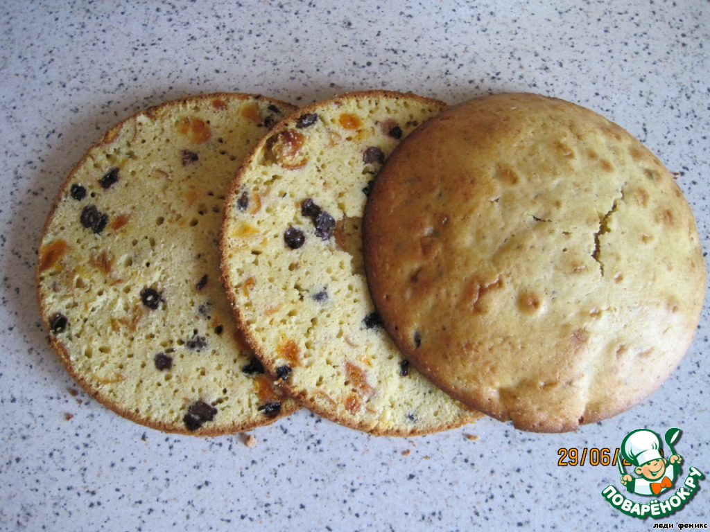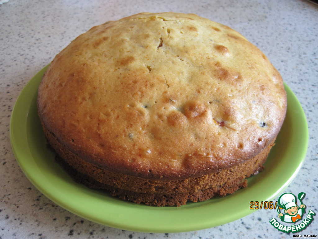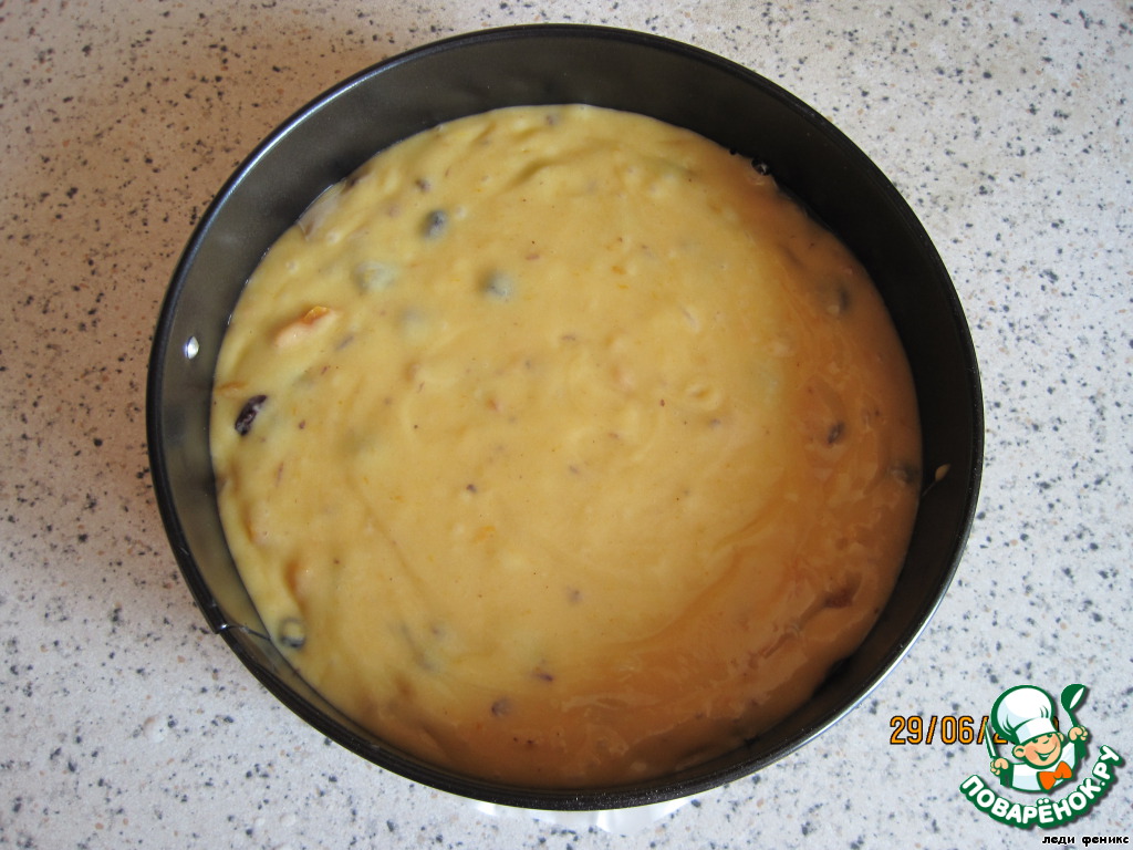 Для теста: взбить сахар с яйцами. Добавить растопленный и охлажденный маргарин, муку, соду и сухофрукты. Вылить в форму.