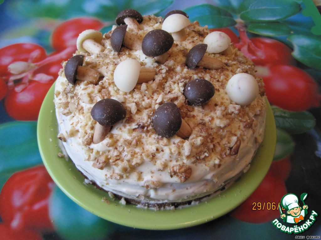 Промазывая коржы, сложить торт. Обмазать весь кремом. Посыпать орехами, украсить. Для украшения использовала покупные грибочки. Дать пропитаться.