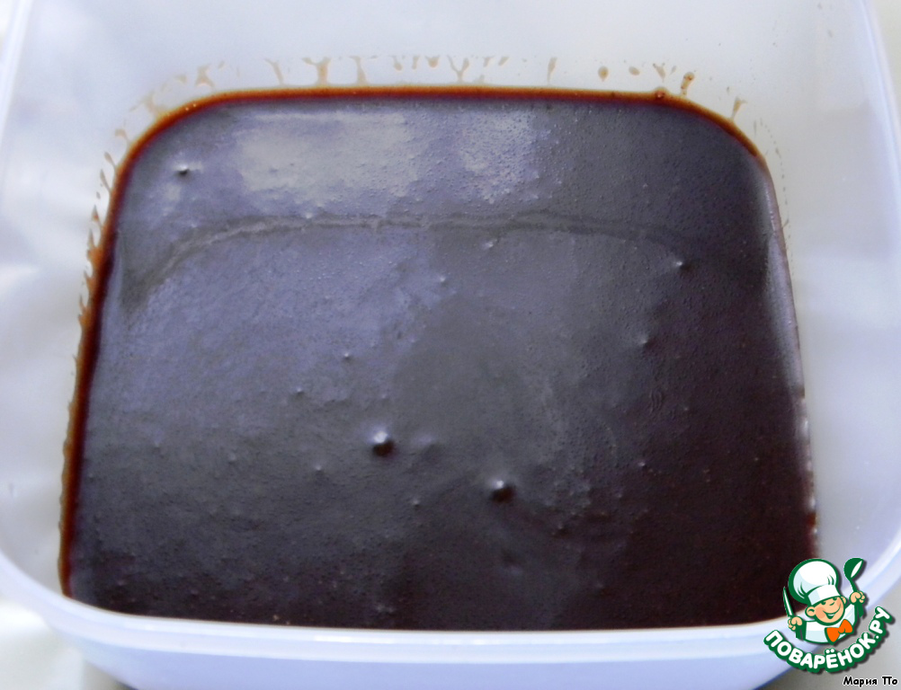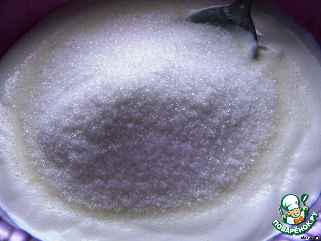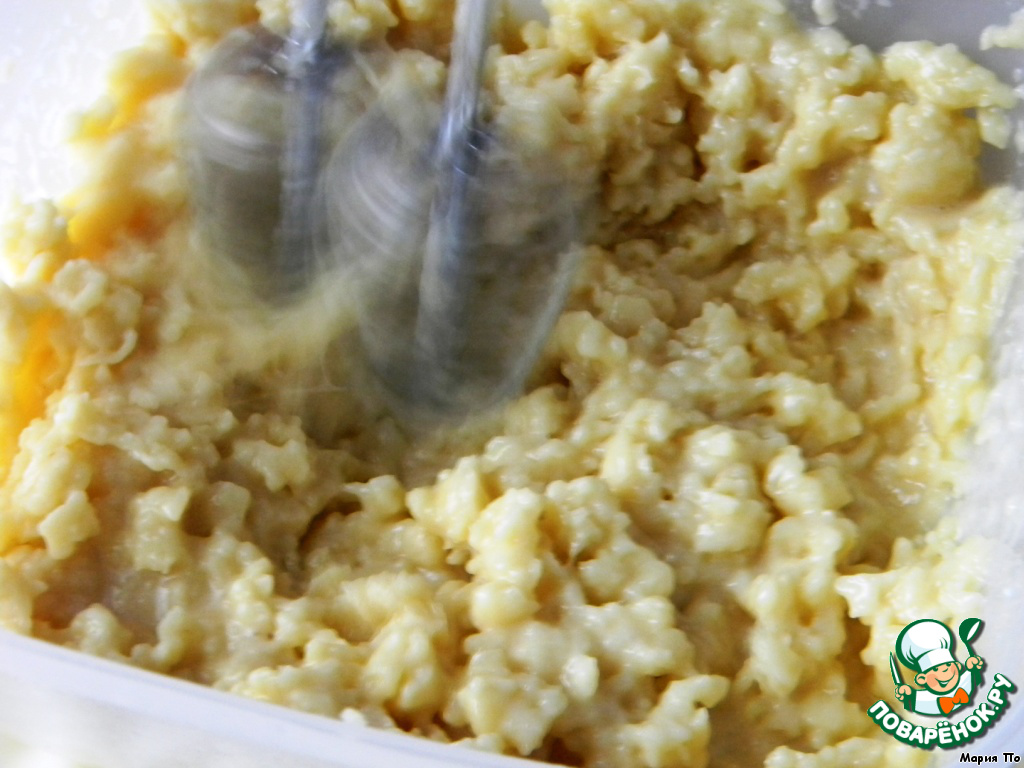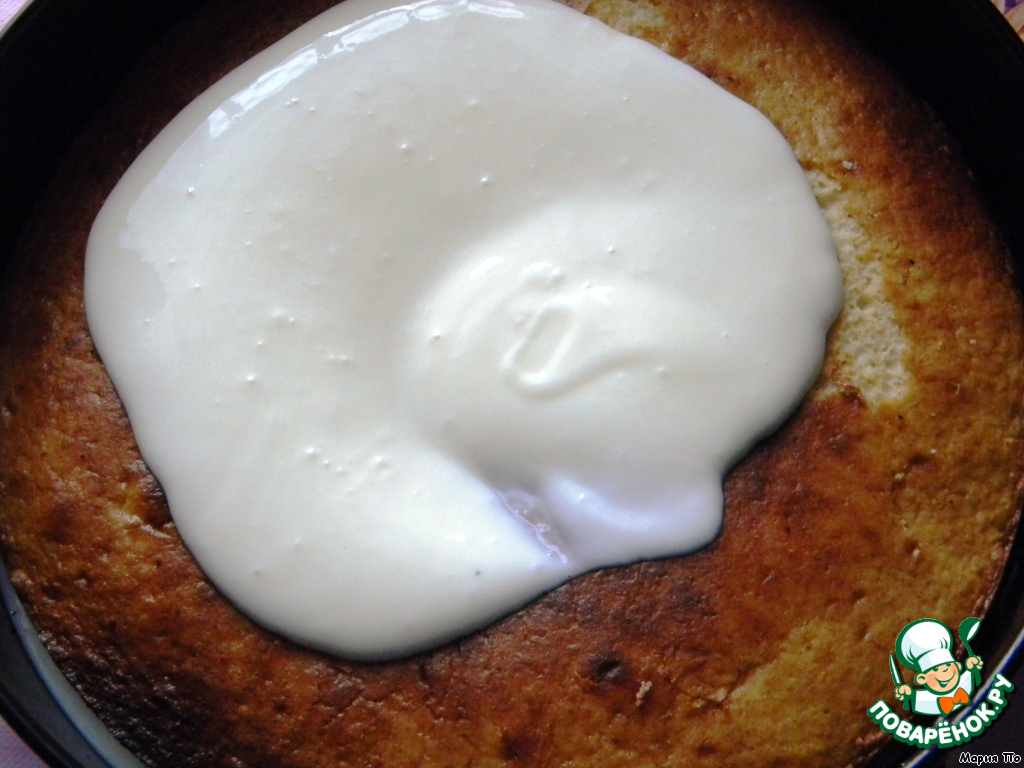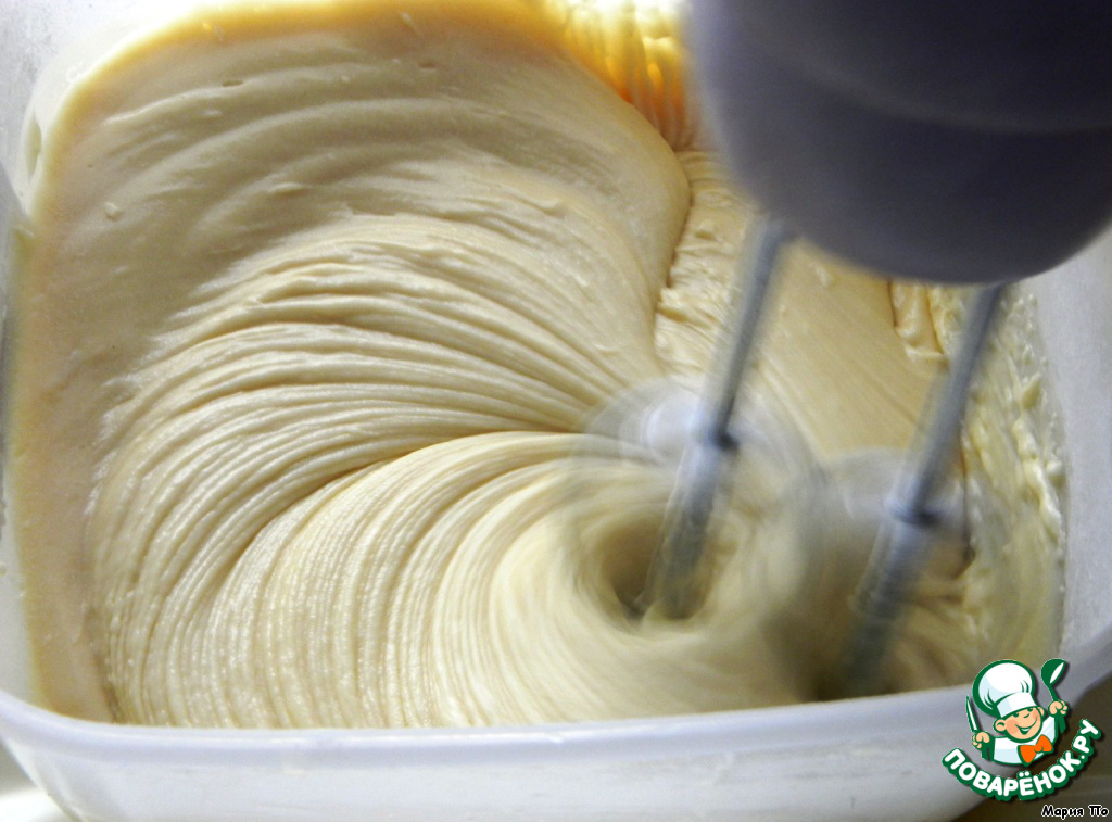 Приготовить тесто для коржей. В ёмкость вылить сгущёнку.