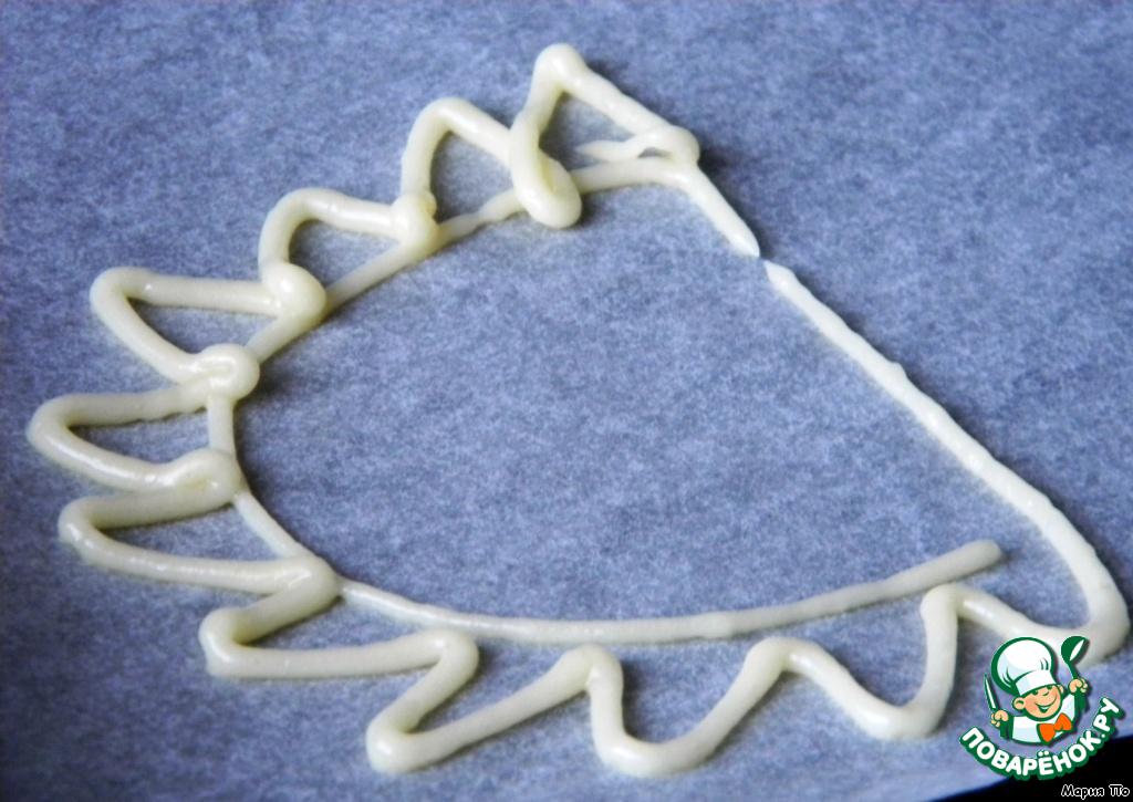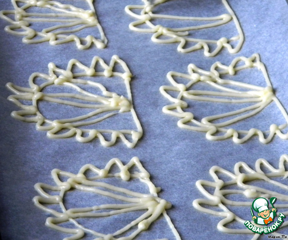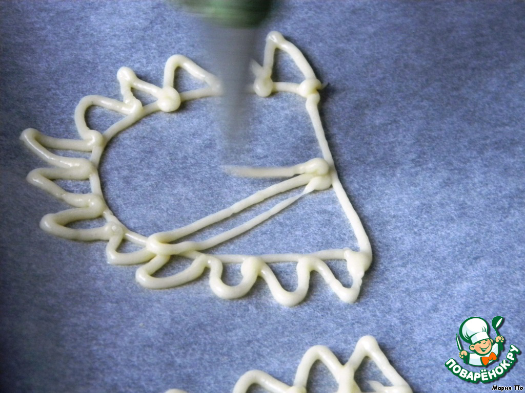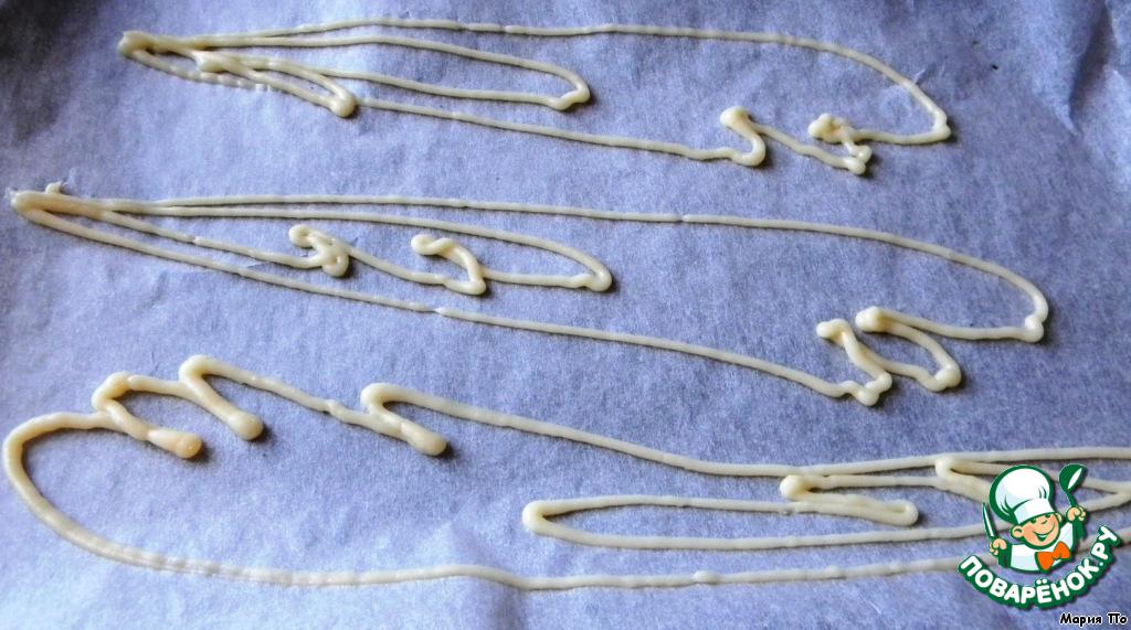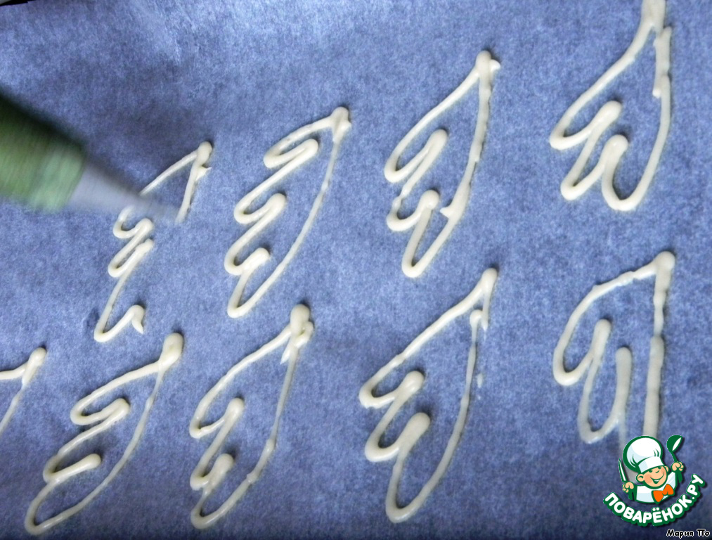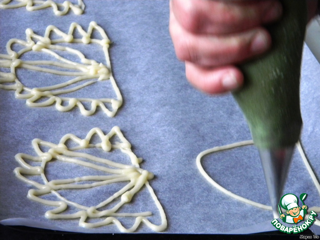 Берём кондитерский мешок с тонкой насадкой (можно взять прочный целлофановый мешок и проделать в нём маленькую дырочку), наполнить его тестом. Лист застелить бумагой и рисовать всё, что придёт Вам в голову (цветочки, снежинки, домики, ромбики, решетки, сердечки и т.д). Для тех, кто хорошо рисует карандашом, не составит труда нарисовать тестом, а остальным надо потренироваться. И всё получится.