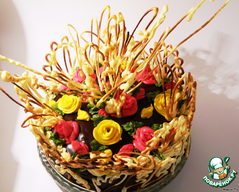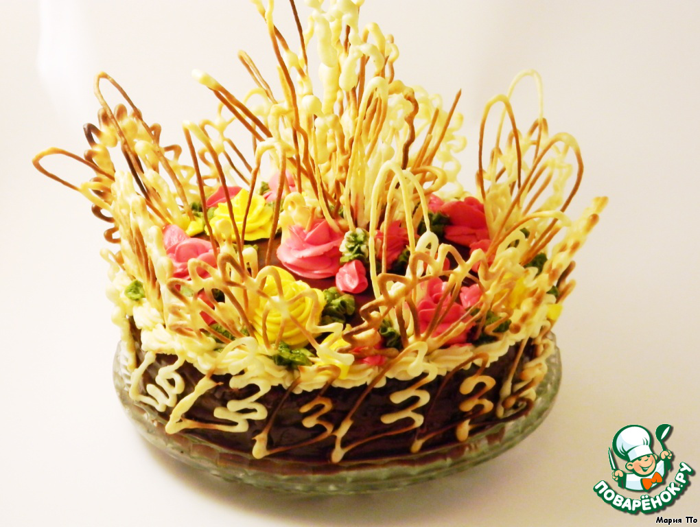 Из масляного крема с помощью кондитерского мешка и разных насадок украшаем торт.