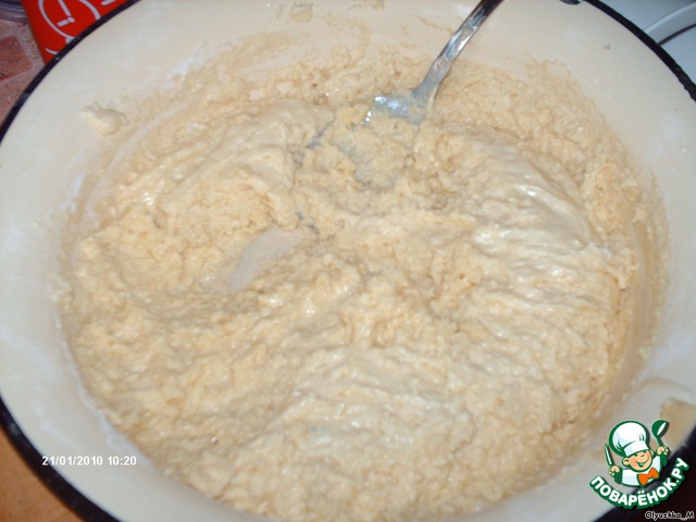 Как я уже писала, тесто у меня получилось очень жидкое и взяло оно 3 стакана муки, поэтому я не стала добавлять еще, а просто размешала и оставила на 10 минут для того, чтобы оно схватилось.