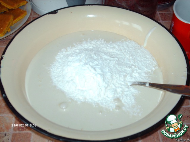 Я добавила 2 ст.л. сметаны, чтобы легче ее было взбить. Сметану, если хотите менее калорийный торт, берем низкой жирности, но при этом она должна быть достаточно густая (я просто эту сметану выложила на дуршлаг с марлей, и лишняя жидкость стекла).