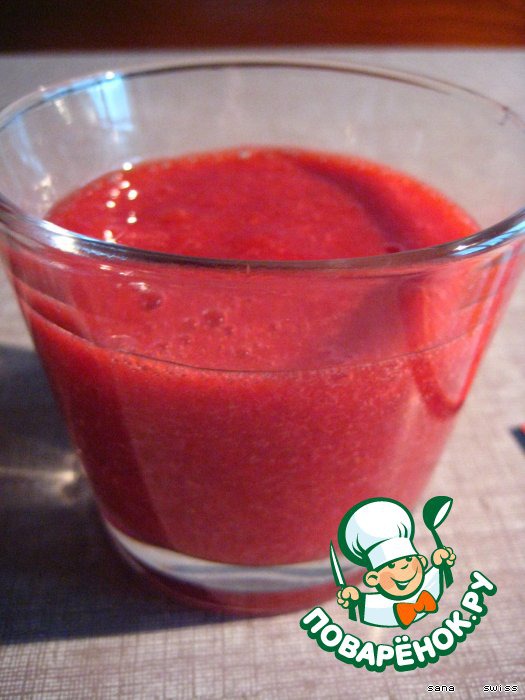 Добавить в бокалы с клубнично-малиновым "гаспаччо", украсить зелеными листиками мяты или базилика, при желании можно еще охладить в холодильнике перед употреблением.