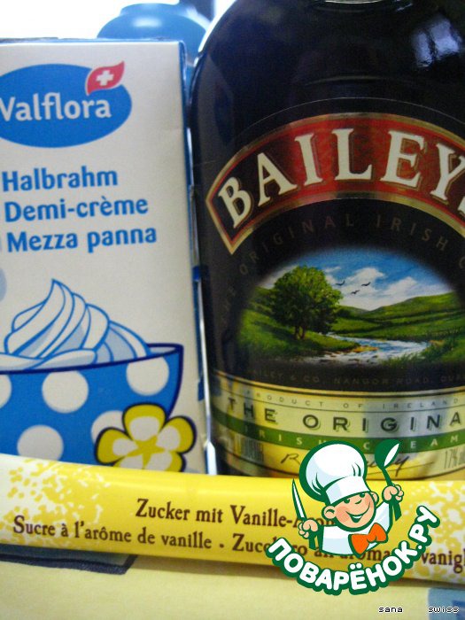 Сливки взбить с добавлением сахара и сливочного ликера.