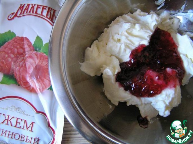 Для малинового крема смешать 150 г творожного сыра, 25 г малинового джема и 1 ч. л. лимонного сока.