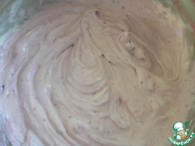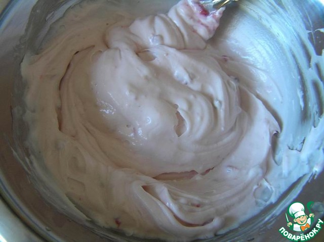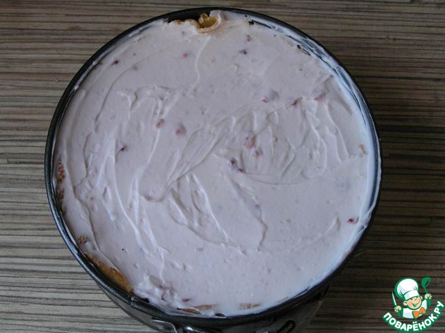 Сверху выложить малиновый крем, разровнять, затянуть пленкой и убрать в холодильник на пару часов.