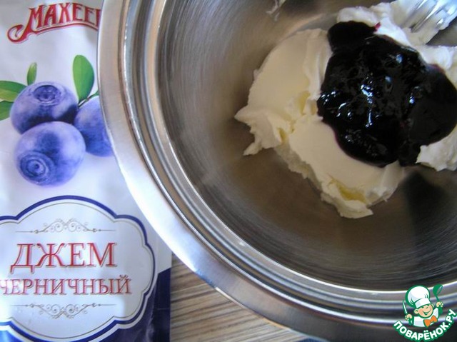 Для черничного крема смешать оставшийся творожный сыр, 25 г черничного джема и лимонный сок.