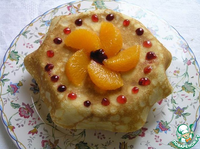 Накрыть оставшимся блинчиком, украсить капельками малинового и черничного джемов. В центр выложить очищенные дольки клементина.