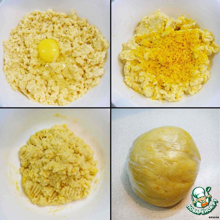 Добавила яйцо, апельсиновую цедру (натерла с одного апельсина на мелкой терке), все тщательно перемешала, тесто сформировала в шар, завернула в пищевую пленку и убрала в холодильник на 30 минут.