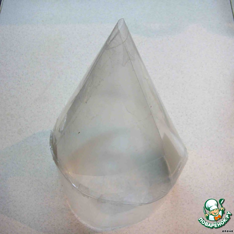 Пока тесто лежит в холодильнике, я занялась нашей елочкой. Я взяла плотную пластиковую пленку и при помощи скотча и ножниц сдела конус.