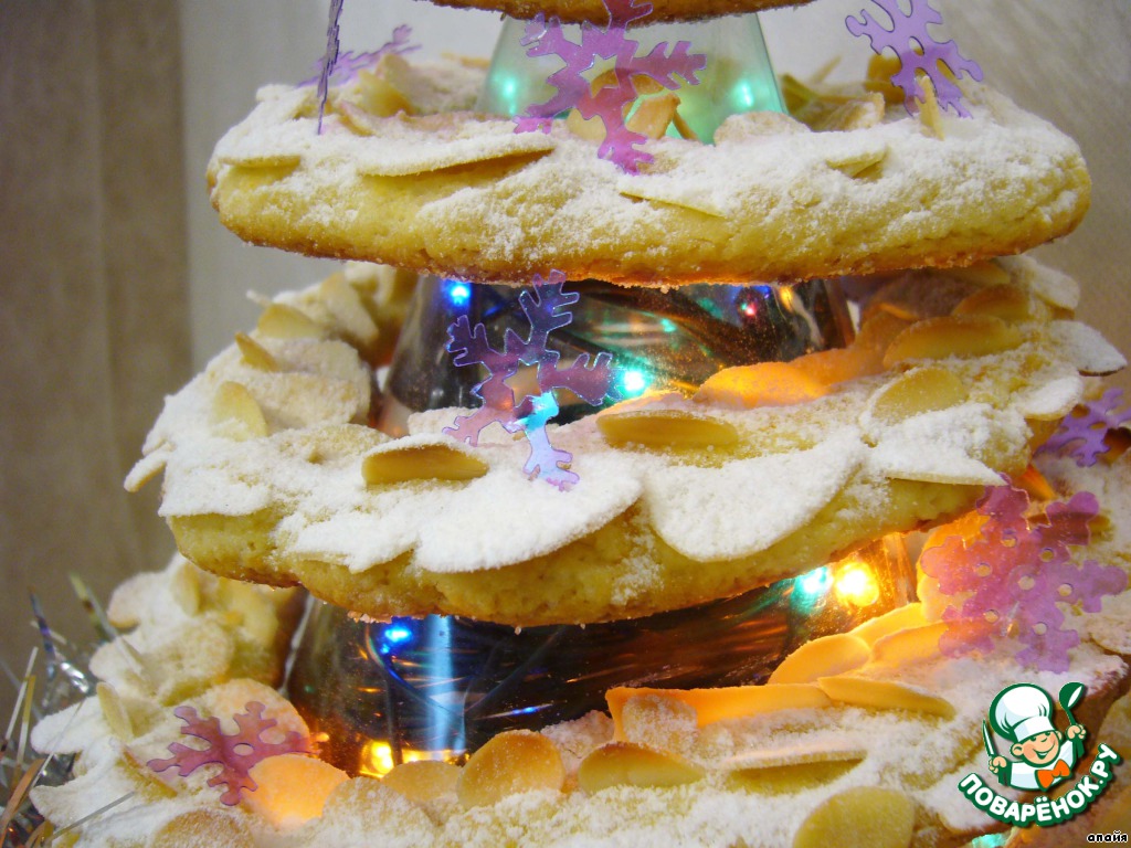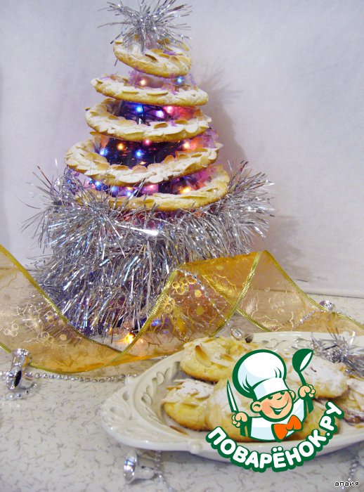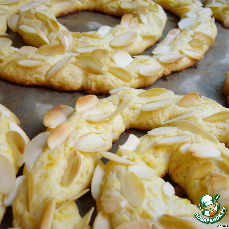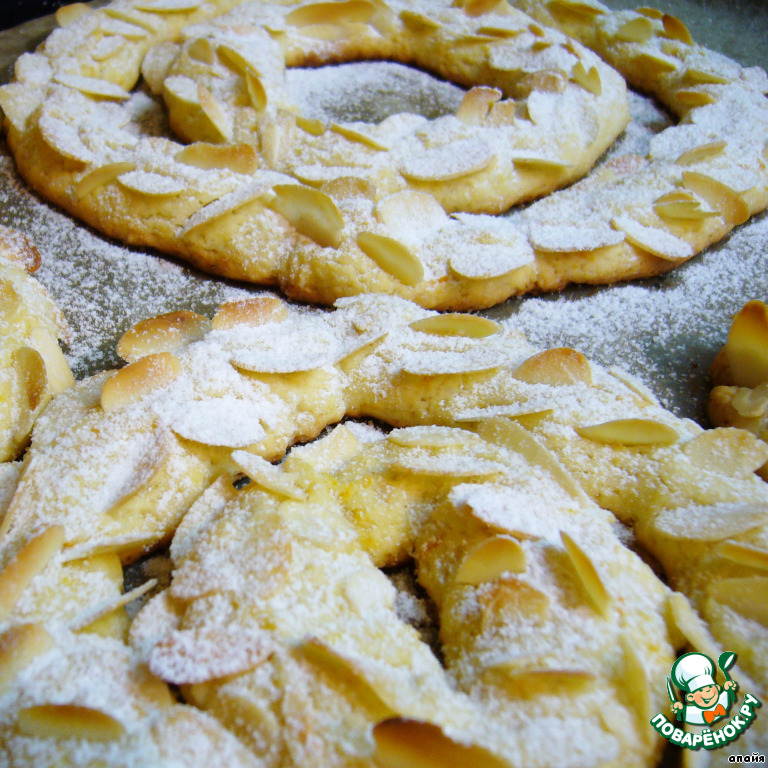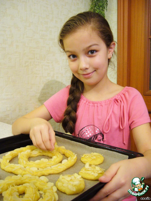 Из теста сделала колечки разных диаметров. Моя дочка украсила печенье миндальными лепестками.