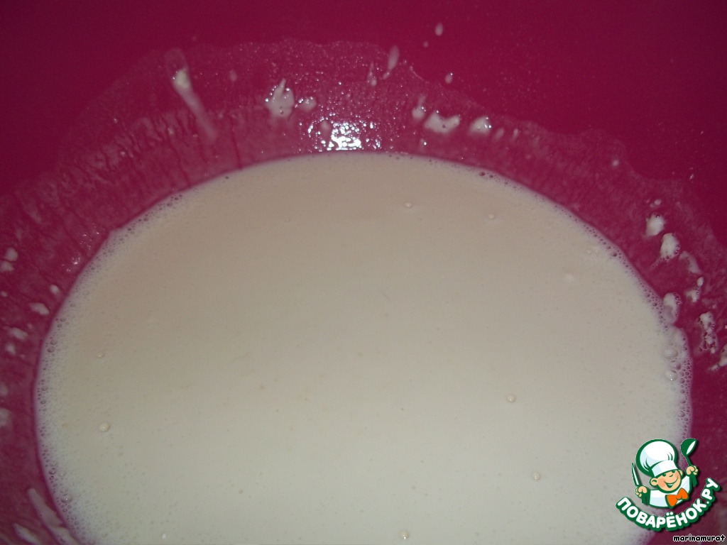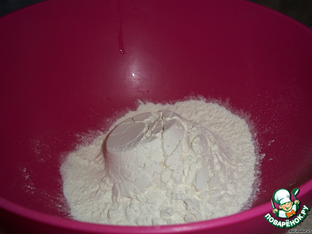 Дрожжи развести в 1 стакане воды, влить в мучную смесь и замесить тесто, постепенно добавляя остальную воду, чтобы тесто получилось гуще блинного. Накрыть тесто полотенцем и оставить на 1 час.