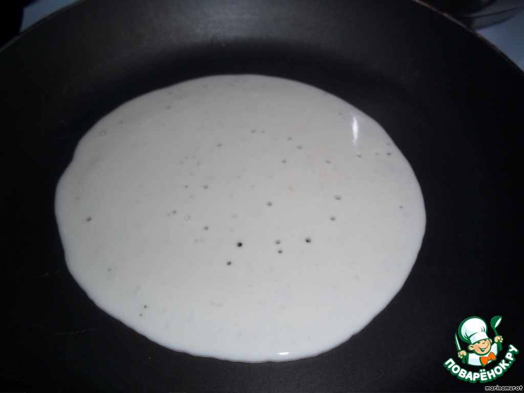 Перед самой выпечкой добавить в тесто 1/3 ч. л. пекарского порошка, хорошо перемешать. Время печь блинчики. Для этого нам пригодится турка маленькая или соусник, чтоб выливать тесто на сковородку. Сковороду хорошо нагреть. Теперь выливаем тесто, чтоб в диаметре блин получился 6-7 см! Сковороду трогать не надо, тесто само разольётся в ровный круг!!! Выпекаются блинчики на сухой сковороде на небольшом огне, только с одной стороны.