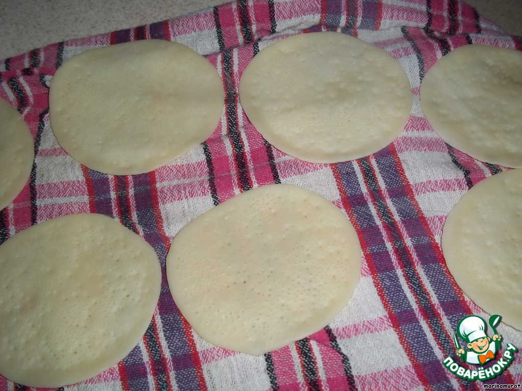Когда поверхность блинчика полностью подсохнет, снимаем его и кладём на стол, застеленный полотенцем, чтобы блинчик не отсырел снизу. Нижняя сторона блинчика не должна быть сильно поджаренной, только слегка румяной.