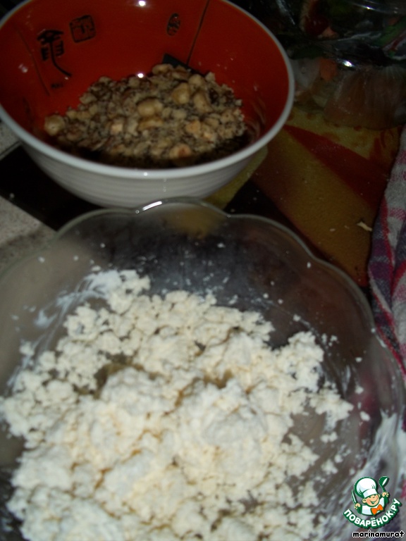 Не лепите катаеф сразу после выпечки; дайте им "отдохнуть" 20 минут. А в это время делаем начинку. Начинки могут быть: грецкие орехи, рикотта, домашний творог, сыр (правда, специальный арабский). Сегодня я делала с творогом и с орехами. С орехами вкуснее всего, поэтому советую делать именно с ними. С творогом я делала первый раз, правда смешала с орехами, вкусно тоже. Грецких у меня не хватило, я измельчила также фундук.