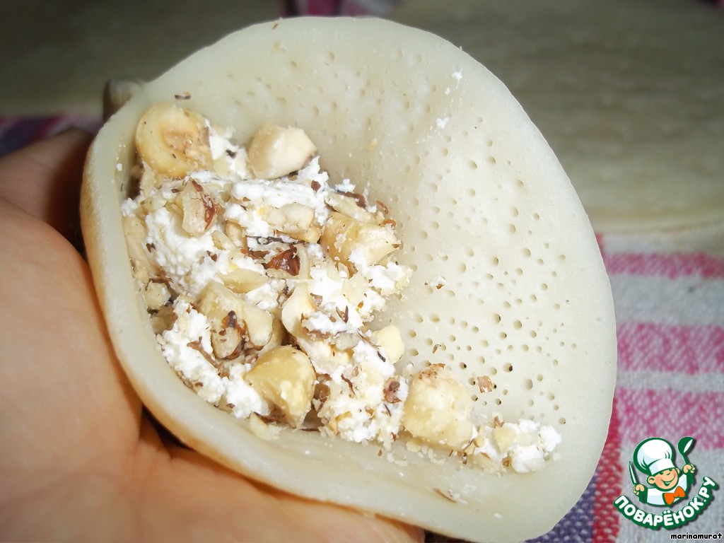 Когда все блинчики готовы, даём им остыть, а затем начиняем орехами, сыром, творогом. Для этого блинчик складываем пополам и начинаем защипывать, как вареник до серединки или чуть меньше. Стороны хорошо прилипают друг к другу.