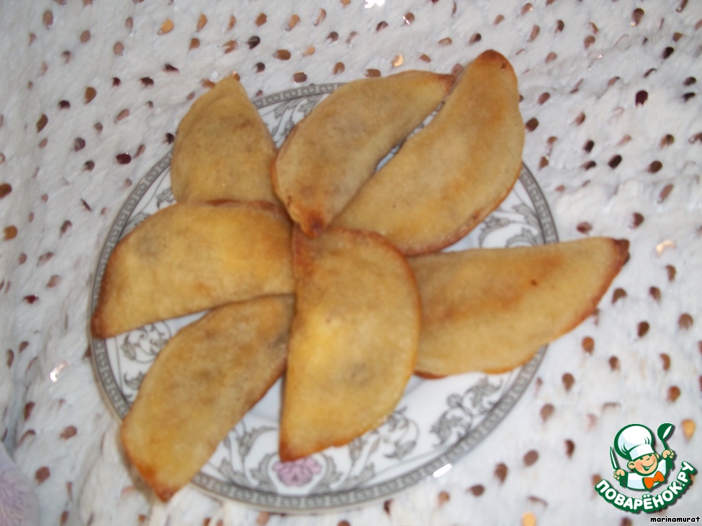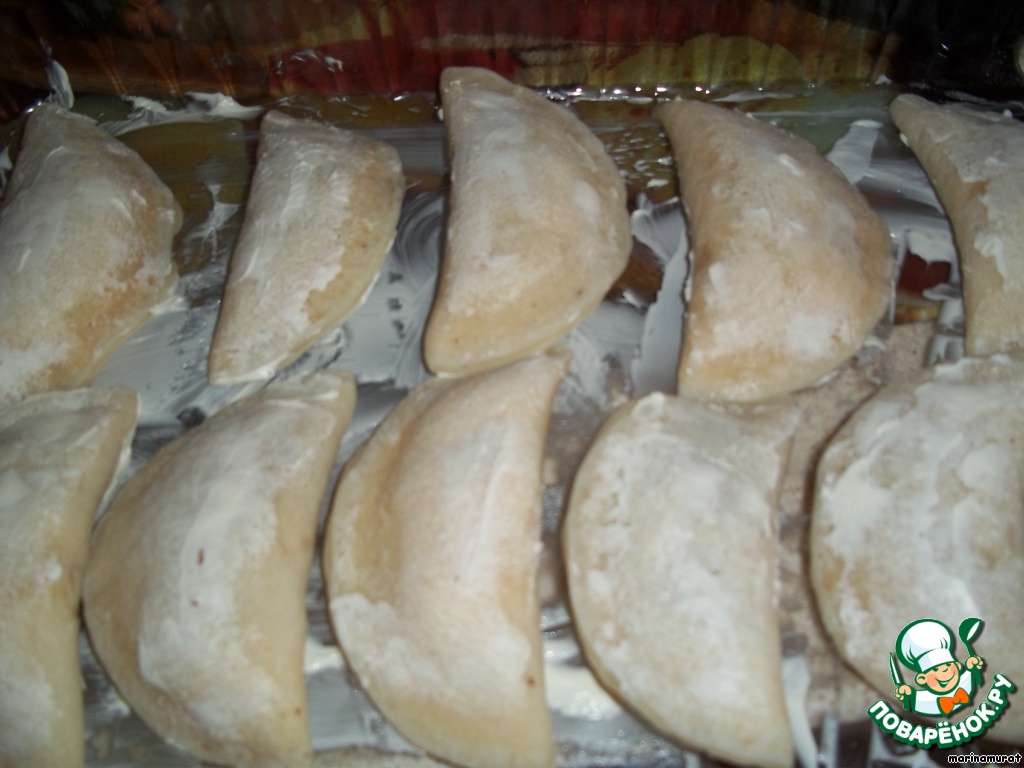 Теперь кладем начинку (я делала несколько только с орехами, и несколько - орехи+творог) и защипываем до конца.