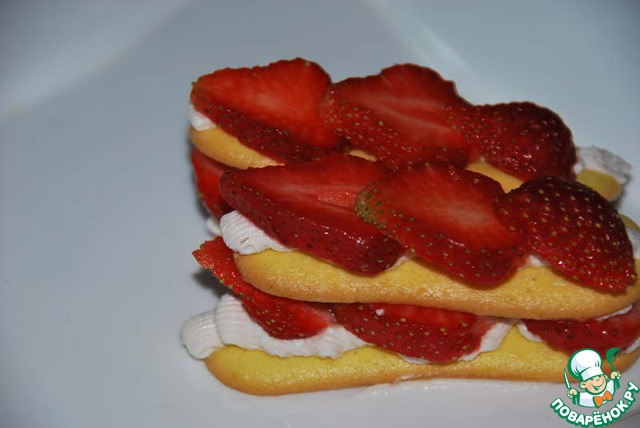Далее на первые пластинки клубнички наносим немного крема и под уголом на крем кладём рядом ещё две палочки савоярди. Не нужно придавливать печенье, десерт должен быть воздушным.