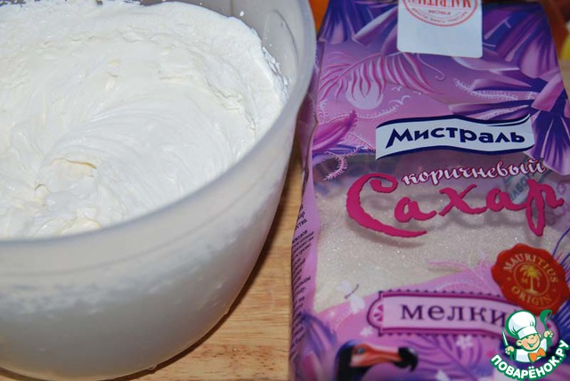 Для приготовления этого десерта используем сахар коричневый мелкий от "Мистраль", он наиболее применим в данном случае.