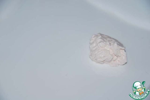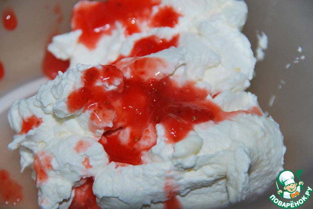 Берём 4 ягодки (можно самые некрасивые) и выдавливаем из них сок с мякотью во взбитые сливки. Можно использовать мелкую тёрку, я брала специальную чеснокодавилку.