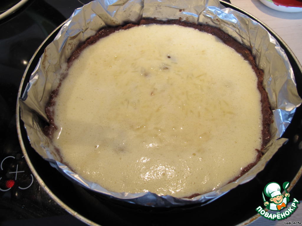 Тесто выложить в форму и распределить его по дну и бортикам формы (у меня была из фольги, в диаметре 19см).