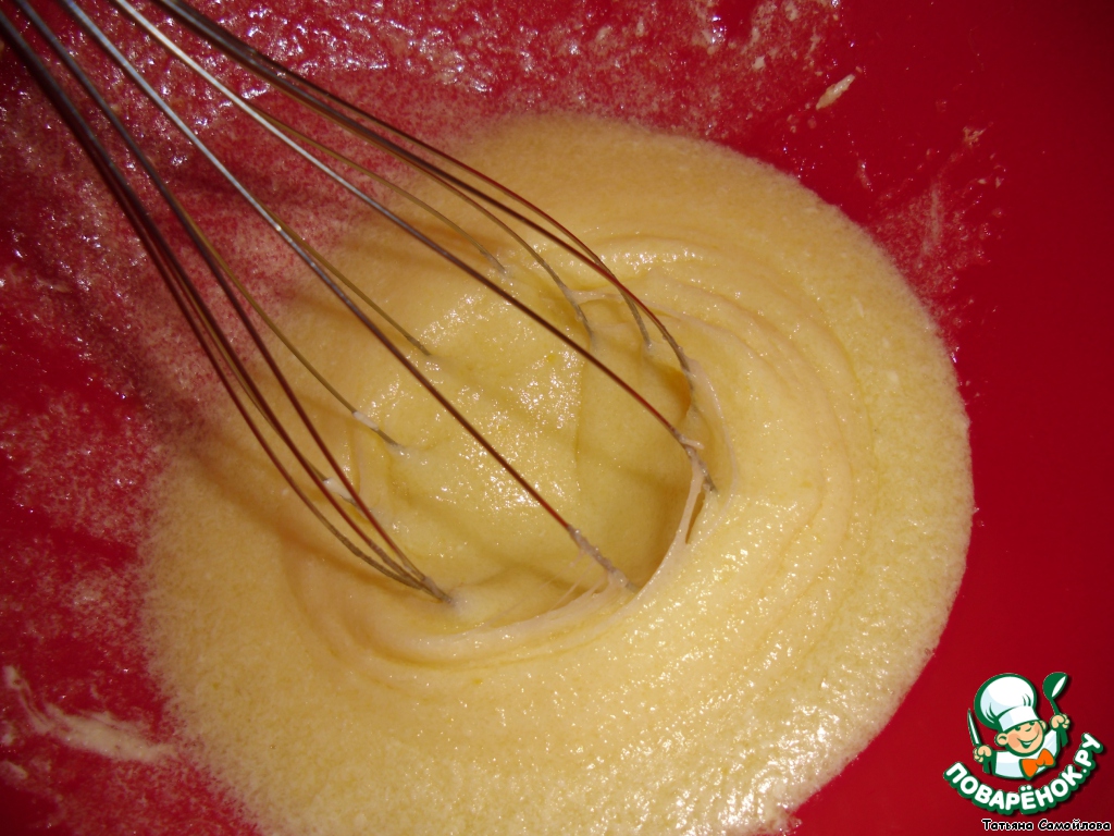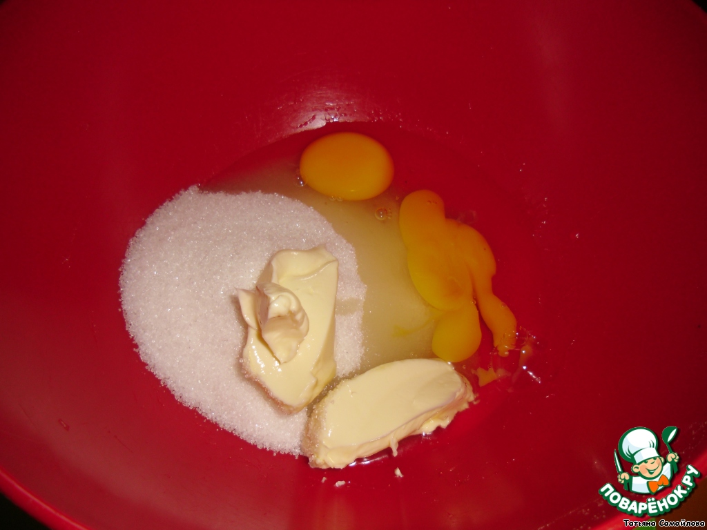 Взбить яйца, сахар и размягченное сливочное масло.