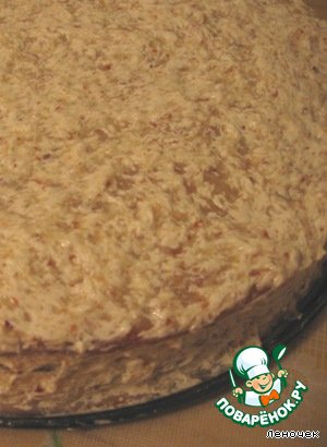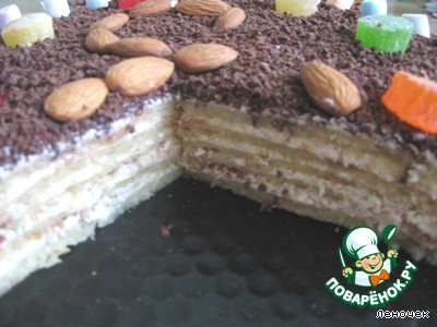 Приготовить крем: орехи залить горячим молоком, перемешать. Добавить белки, масло, сахар, тщательно перемешать до однородной массы. Когда все коржи будут готовы и остынут, смазать каждый кремом, накладывая их друг на друга (в общем, как обычно).