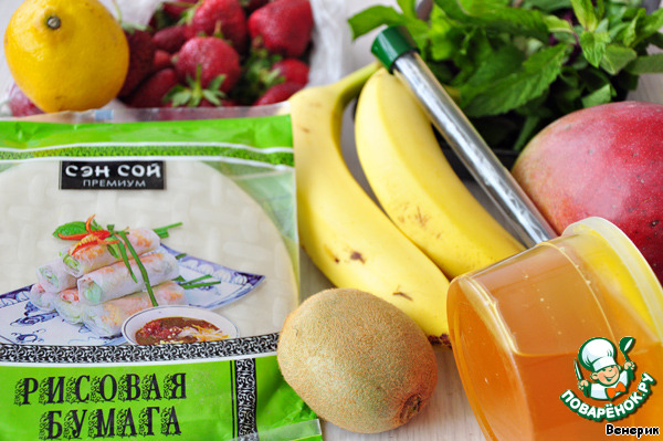 На лист бумаги выкладываем немного манго, киви, бананы, клубнику, сыр, пару листиков мяты и сворачиваем конвертиком.